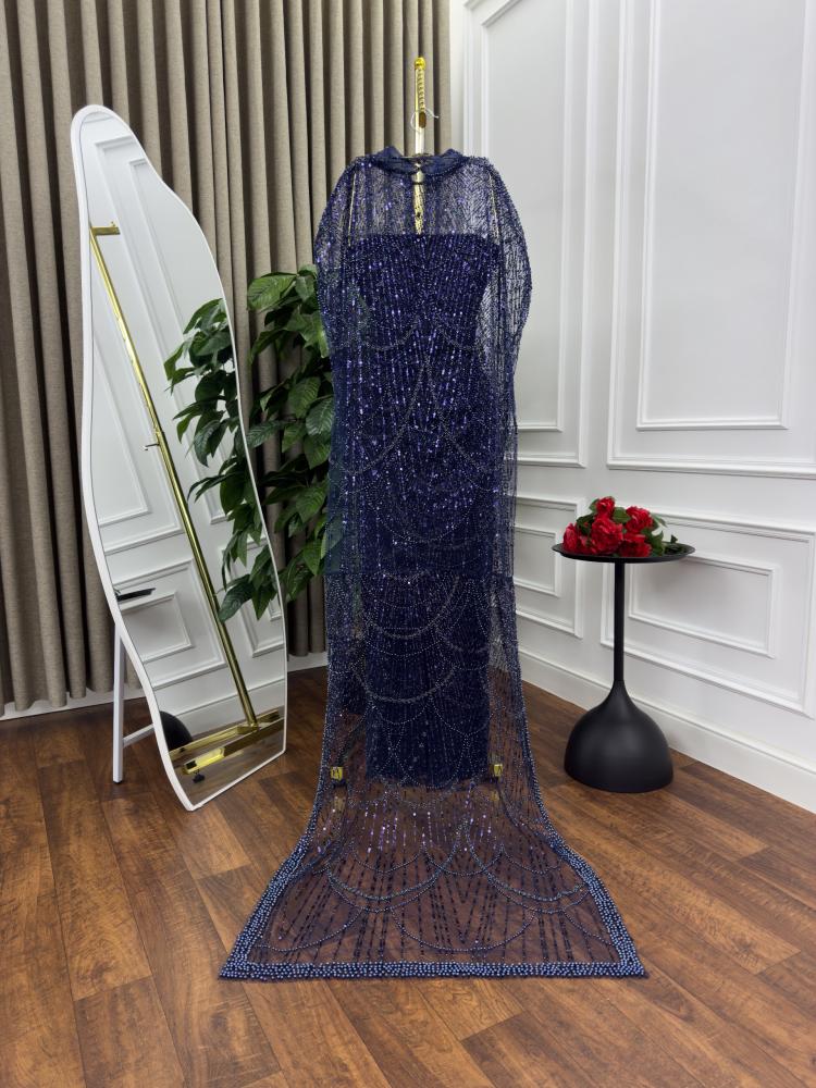 - الخامة: صُمم من قماش التل المطرز بدقة متناهية. هذا التطريز الغني باللؤلؤ والخرز يضفي على الفستان بريقًا وسحرًا خاصًا، ليجعلكِ تشعين جمالًا تحت الأضواء.
