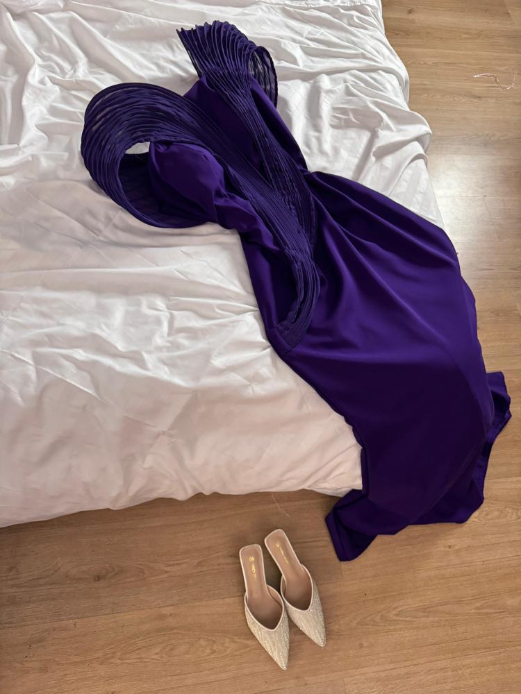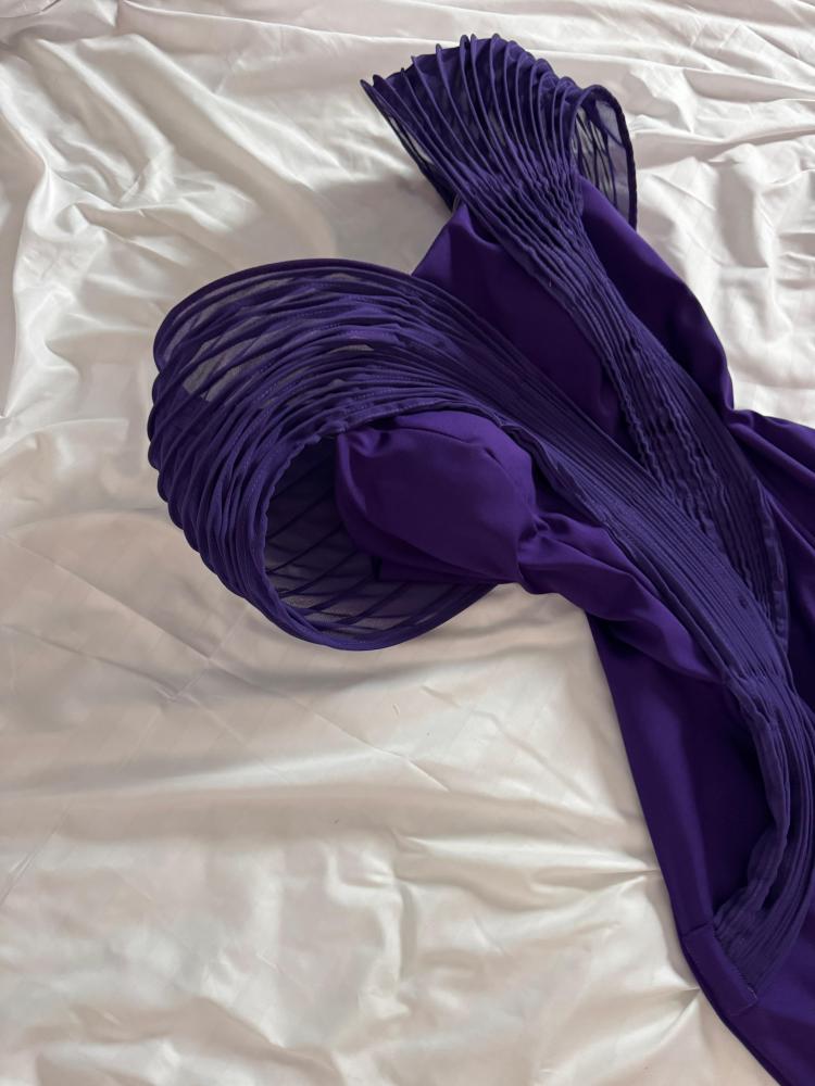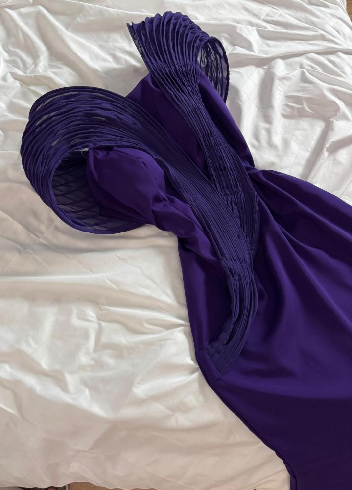 🧵 القماش: كريب ناعم بتفاصيل هندسية مطوية (pleated structured design)