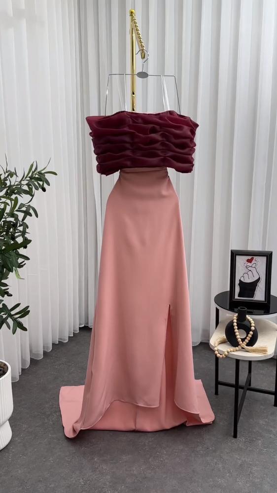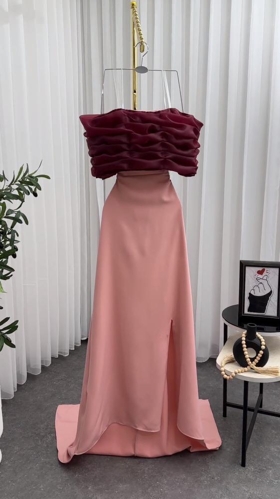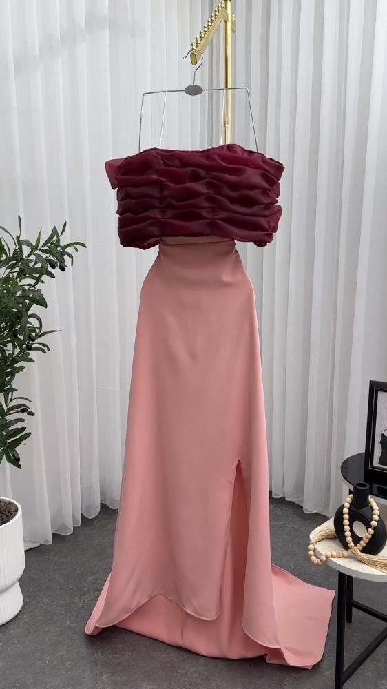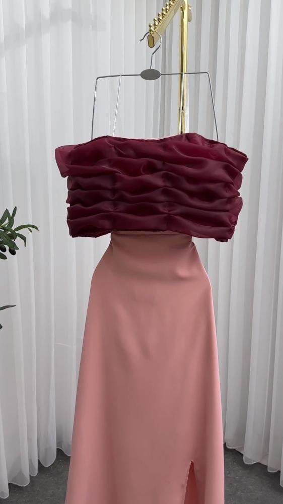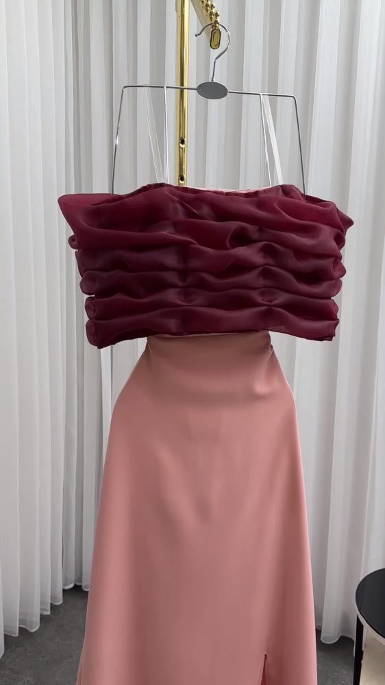 صدر بلون خمري (عنابي) مع طيات كثيفة أنيقة تضيف حجماً وجرأة للتصميم.