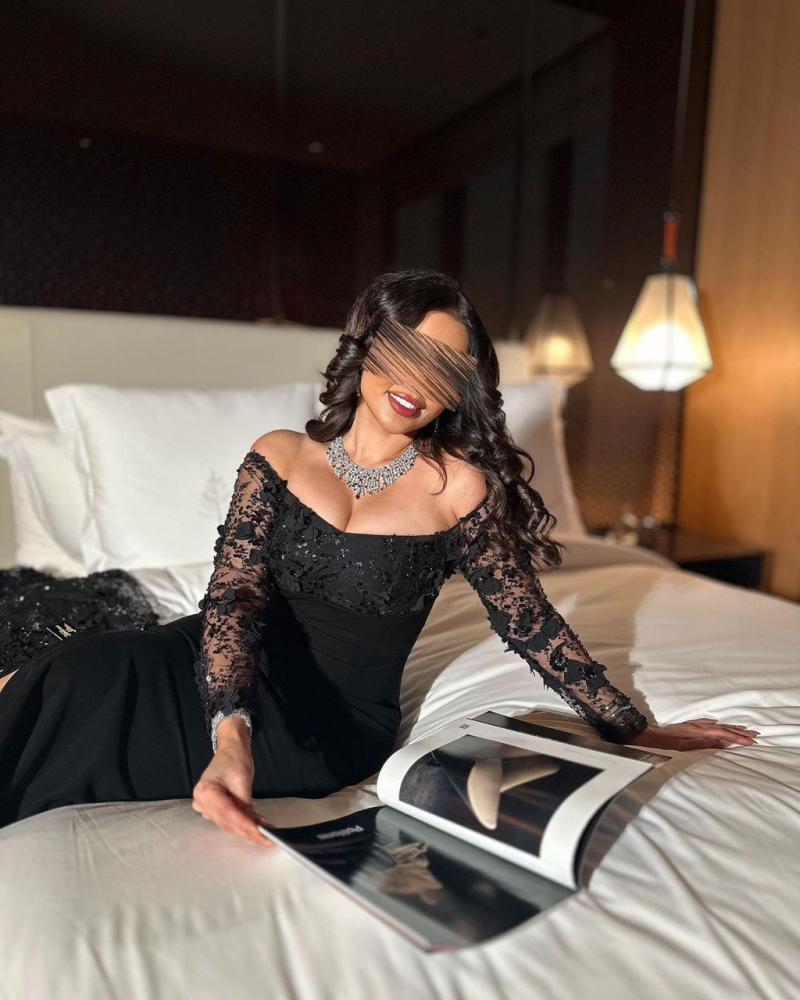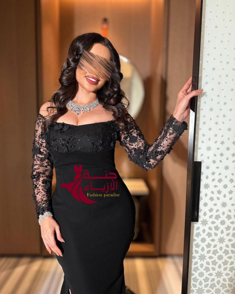 التفاصيل: أكمام طويلة من دانتيل مطرّز شفاف، فتحة أمامية عالية، تطريز لامع خفيف في الذيل
