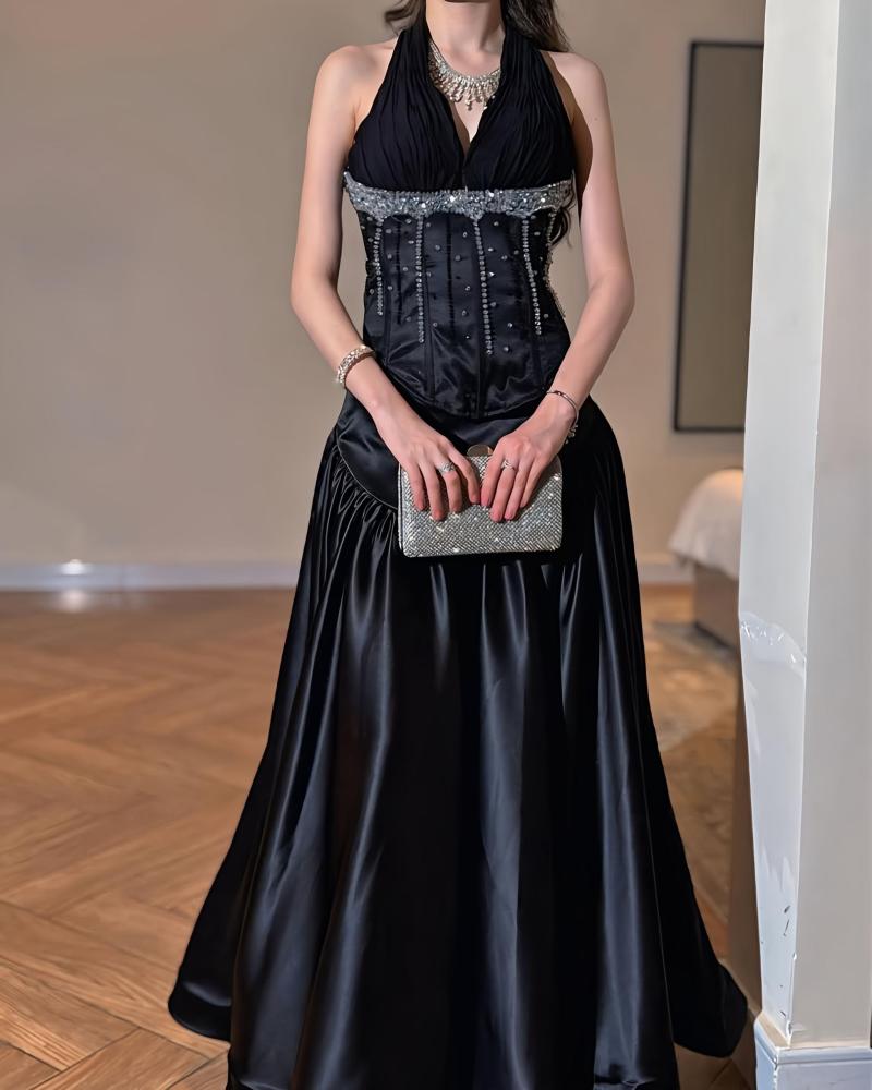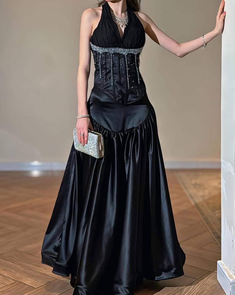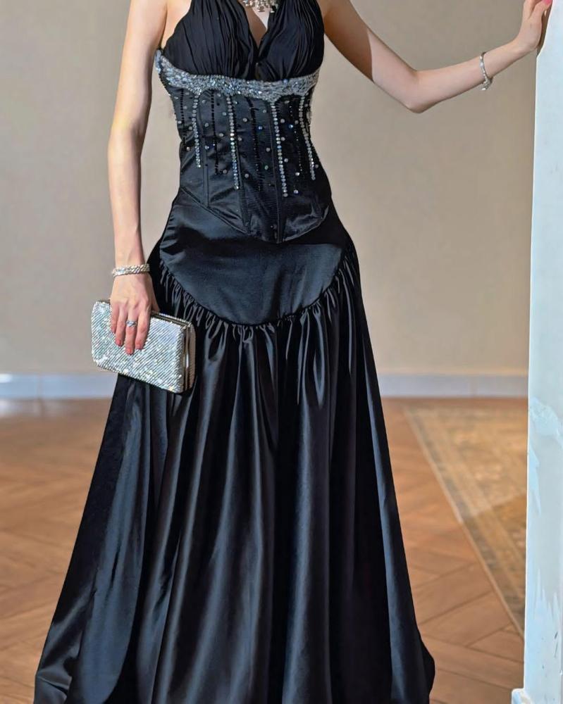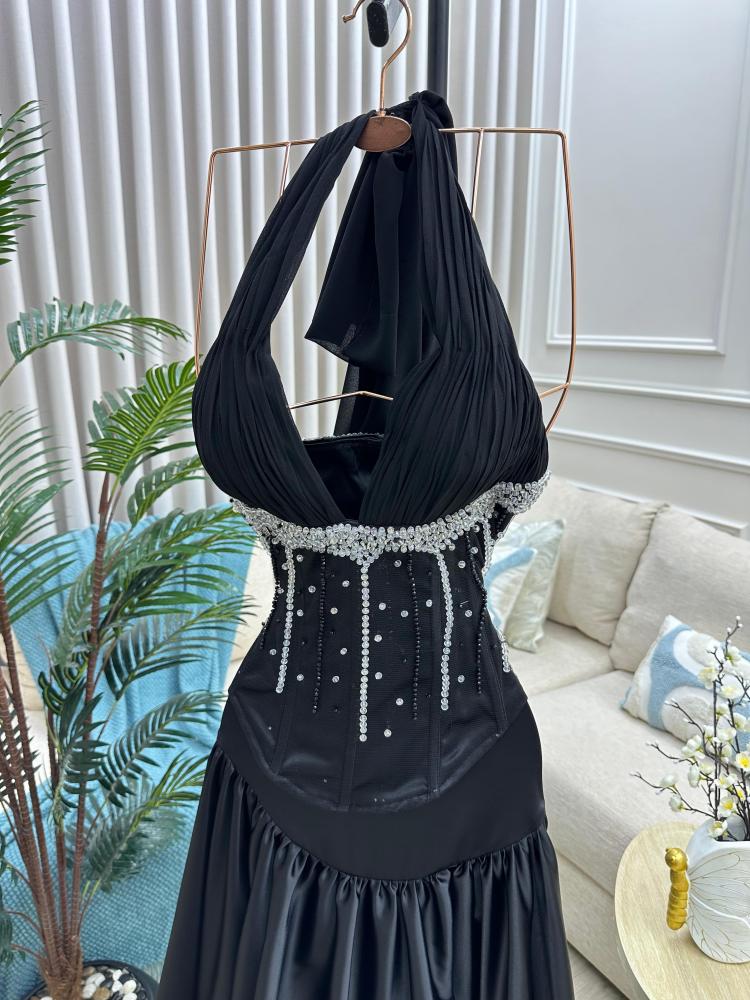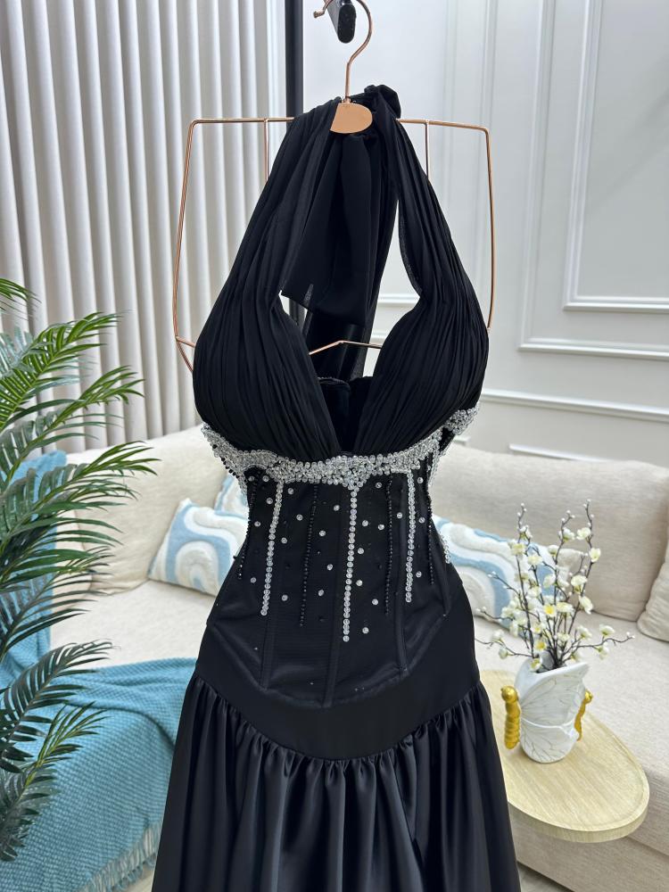 الجزء العلوي: تصميم "هالتر" بدون أكمام، مع ياقة مزمومة تضيف لمسة أنثوية راقية.