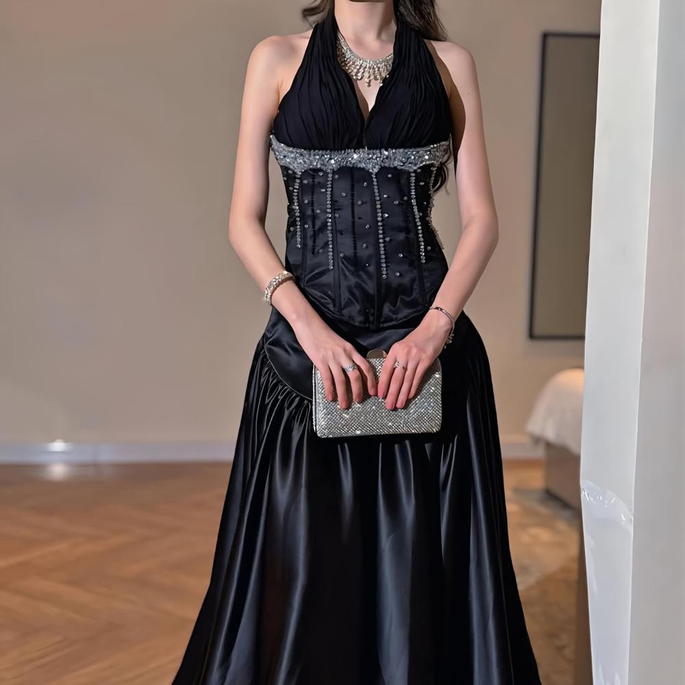 الإكسسوارات: تم تنسيقه مع عقد فخم وشنطة يد لامعة لتعزيز الطابع الرسمي للفستان.