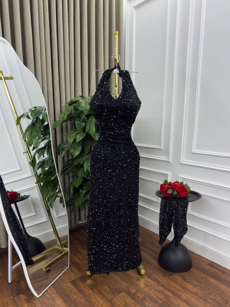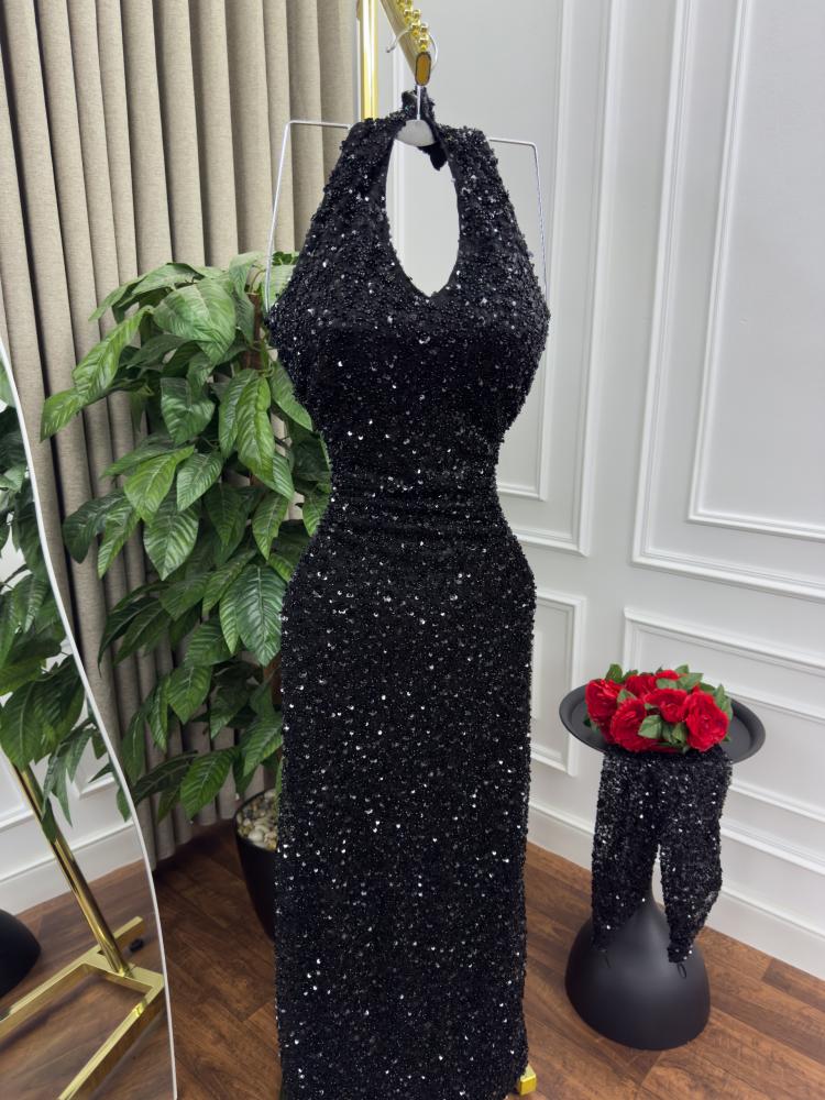 فهذا الفستان الأسود اللامع هو خياركِ الأمثل للتألق بثقة وجاذبية لا مثيل لها.