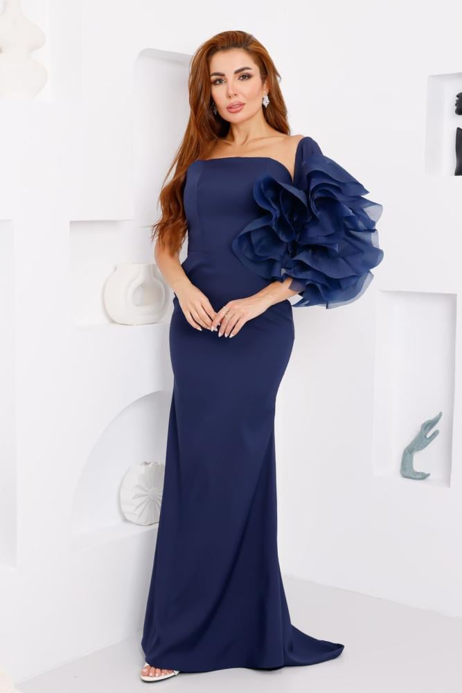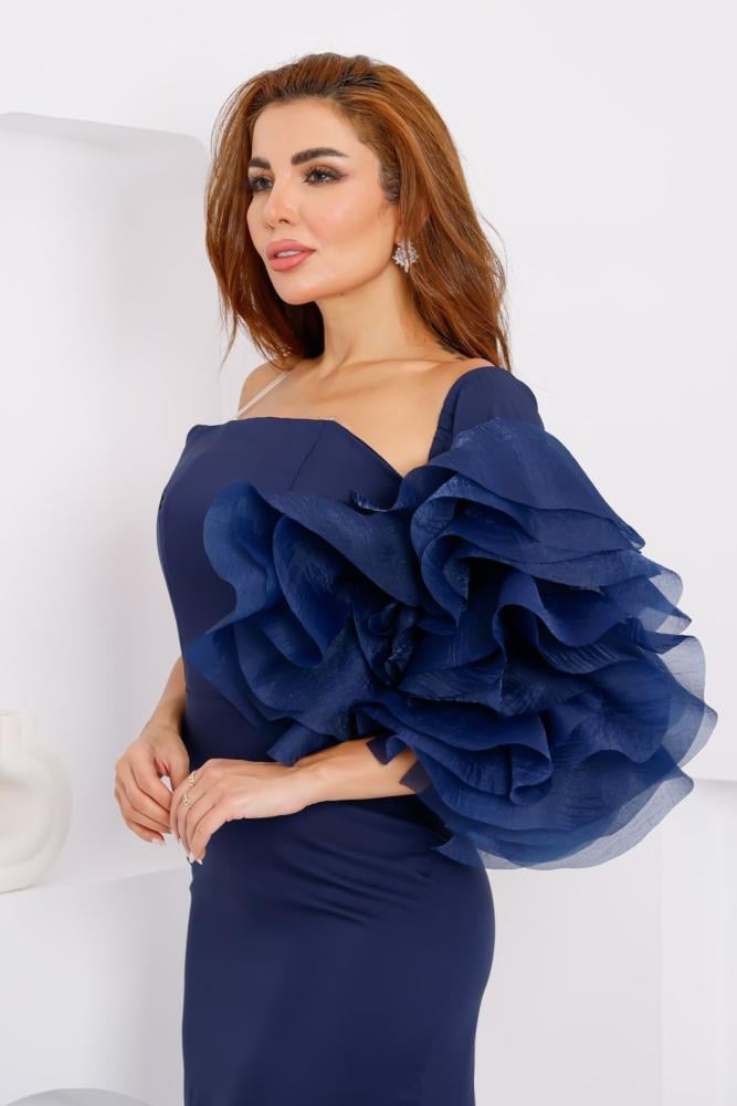 يأتي هذا الفستان بلون كحلي داكن (Navy Blue)، يضفي عليه لمسة من الرقي والتميز والفخامة الخالدة. أبرز ما يميزه هو الكم الأيمن ذو التصميم الدراماتيكي من الكشكشات الكبيرة المصنوعة من قماش شفاف نسبيًا، مما يمنحه لمسة فنية وجريئة تخطف الأنظار فورًا.