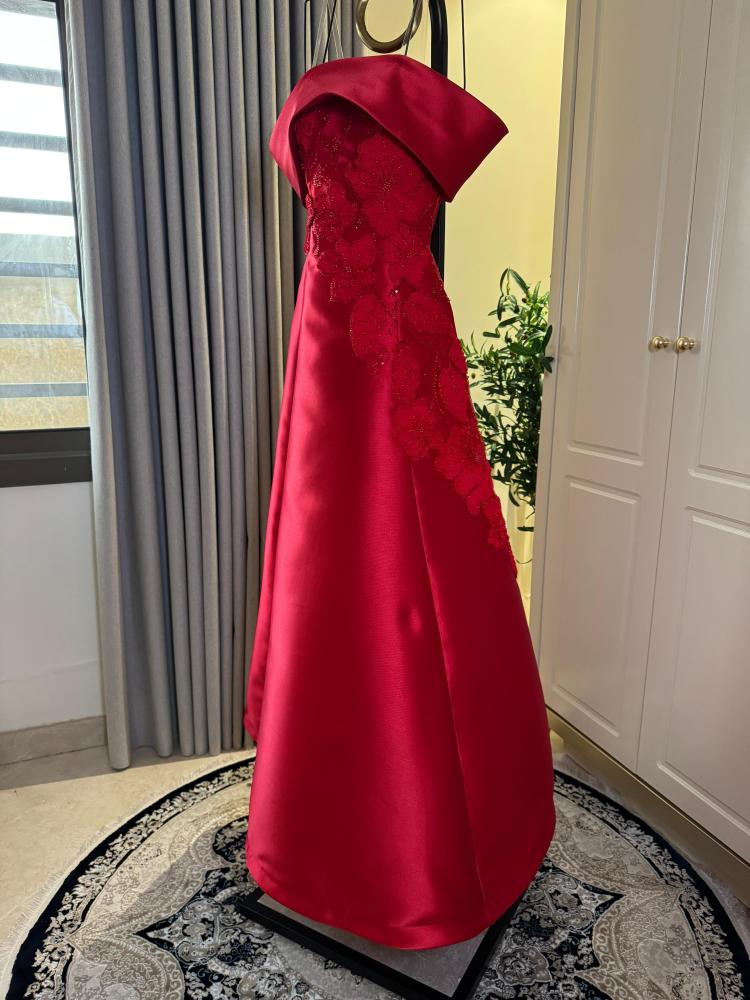 • الخامة: صُنع من ميكادو مطرز ورود، وهو قماش فاخر يشتهر بقوامه الثابت ولمعانه الخفيف، مما يضفي على الفستان حجمًا أنيقًا. تزينه تطريزات دقيقة على شكل ورود تزيد من فخامته وجاذبيته.